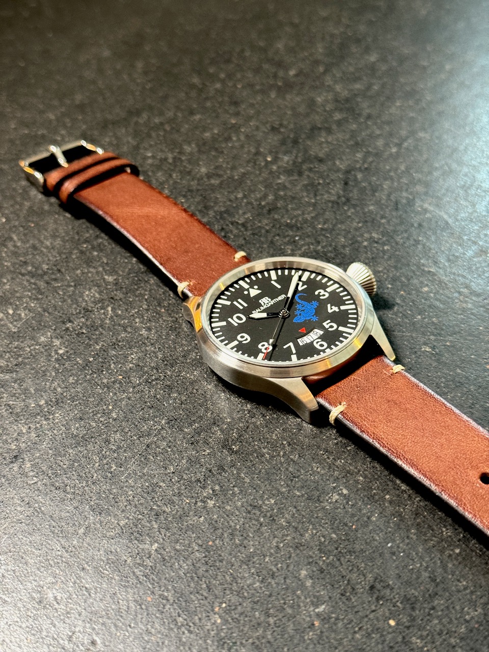 Im Innern tickt zuverlässige und Chronometer-genau ein ETA 2824 oder Sellita SW200-Uhrwerk mit einer Gangreserve von 40 Stunden. Mit der grossen Krone, typisch für Fliegeruhren, wurde ein weiteres markantes Merkmal gesetzt. Das Armband aus exquisitem braunem Kalbsleder unterstreicht die Individualität dieses technischen Meisterwerks. Was diese Uhr allerdings zu einem besonderen Unikat macht, ist der Gecko – das Wiesmann Emblem in einem intensiven Blau - das nun das schwarze Zifferblatt sowie den Glasboden ziert.